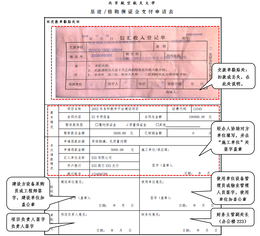 (2)《基建/修购保证金支付申请书》填写示意如下: